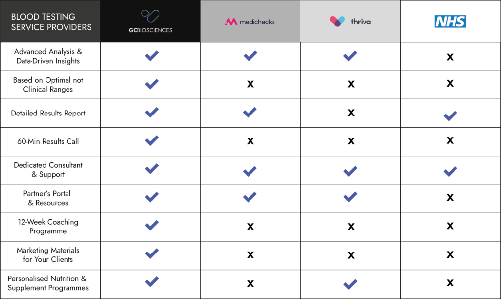 The truth is the health and fitness industry is becoming increasingly commoditised and saturated. It’s harder and harder to differentiate yourself and your services and stand out from the crowd. Advanced blood testing and data-driven insights, allow you to truly personalise your programmes, deliver life-changing results for your clients, and charge more for your services. As an official GC Biosciences Partner, you can stop trading time for money, avoid burnout and get well rewarded for doing what you love.